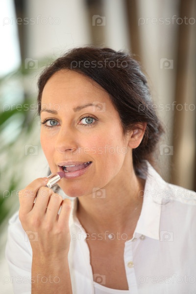 Брюнетка наносит помаду