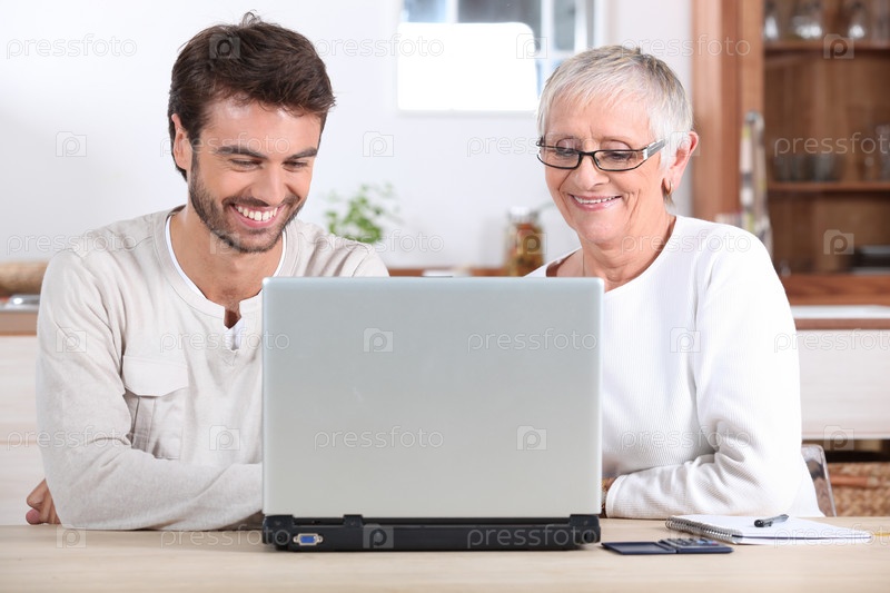 Молодой человек и его мать используют ноутбук