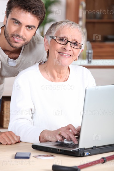 Молодой человек и его мать используют ноутбук