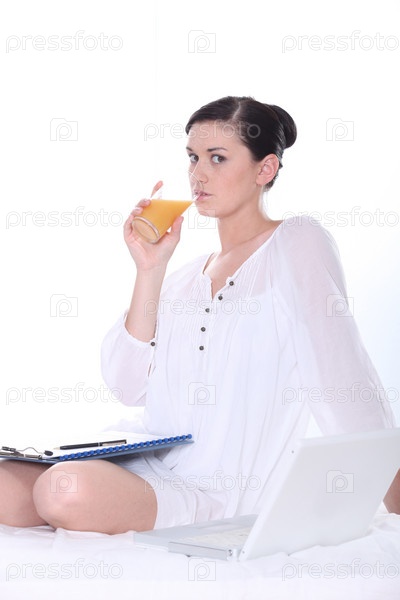 Женщина пьет сок с ноутбуком и планшетом