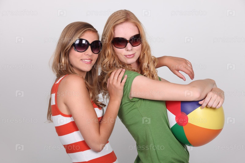 Двое подростков в солнцезащитных очках держат пляжный мяч