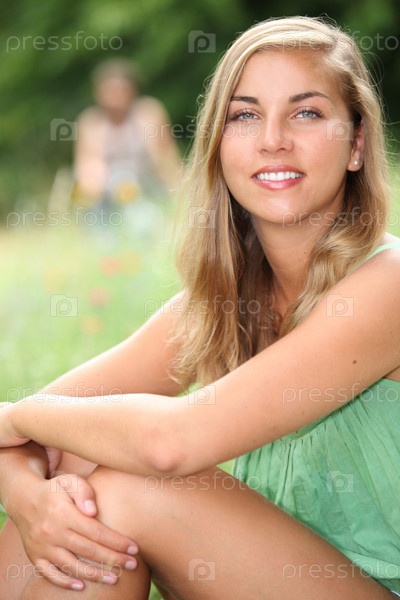 Молодая женщина сидит на летнем лугу