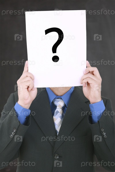 Молодой предприниматель держит белый плакат с вопросительным знаком