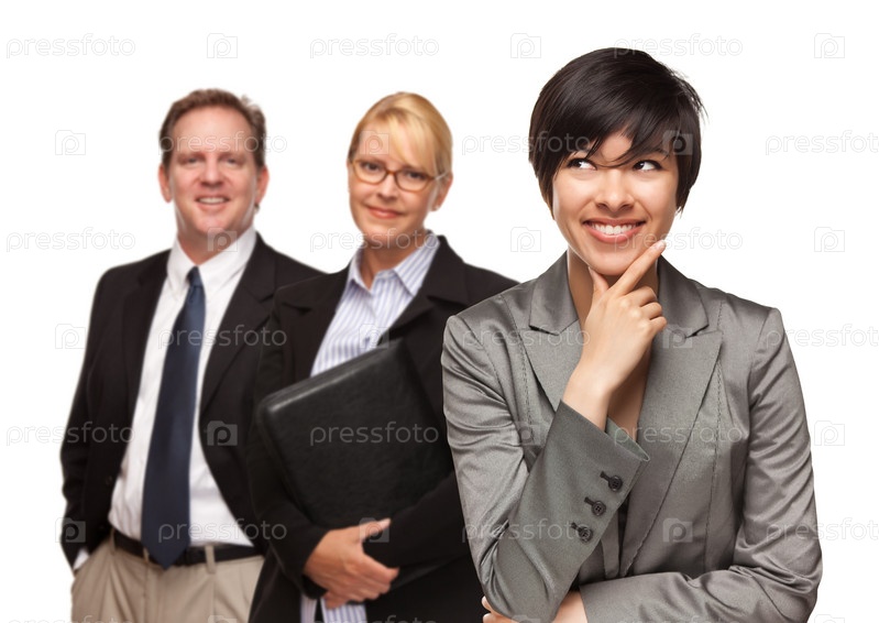 Бизнес-леди с командой на белом фоне