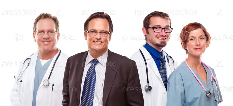 Улыбающийся бизнесмен, врачи и медсестры