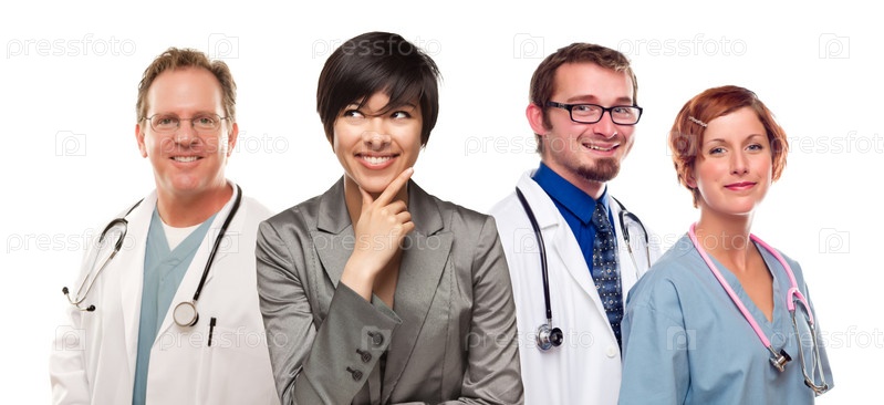 Улыбающаяся бизнес-леди, врачи и медсестры
