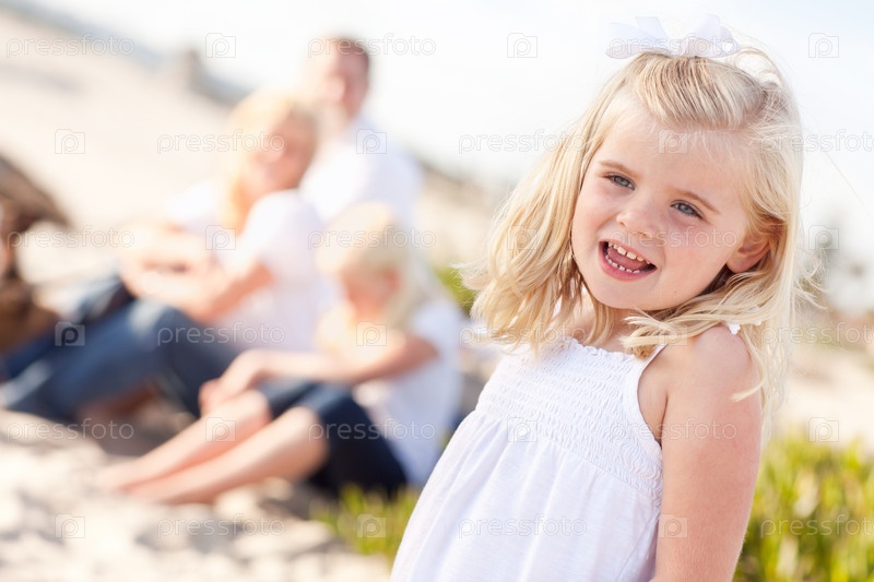 Очаровательная белокурая девочка отдыхает на пляже