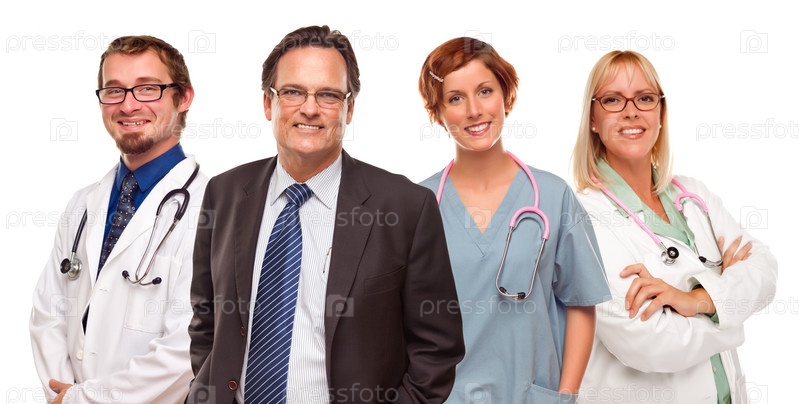 Улыбающийся бизнесмен, врачи и медсестры
