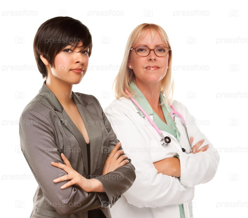 Молодая женщина смешанной расы и женщина-врач или медсестра на белом фоне