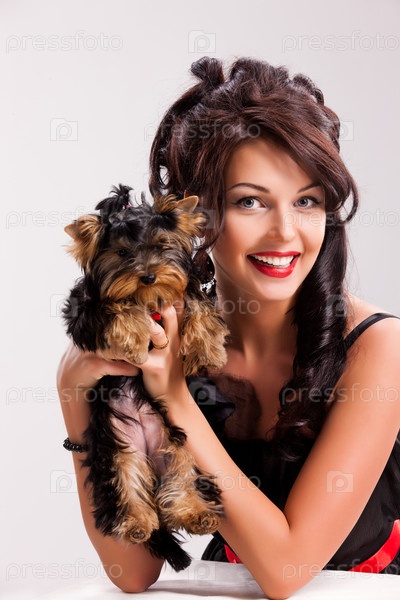 Молодая красивая брюнетка с йоркширским терьером