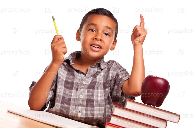 Испаноязычный мальчик с поднятой рукой, книги, яблоко, карандаш и бумага