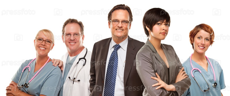 Молодая женщина, бизнесмен и врачи