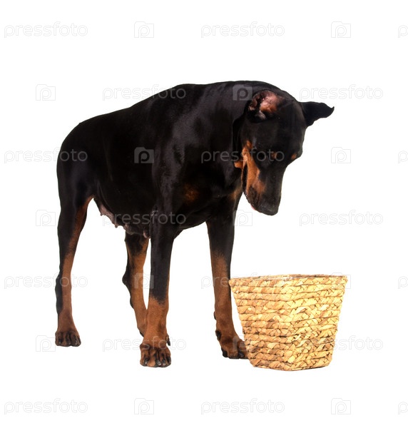 Собака в поисках пищи в корзине