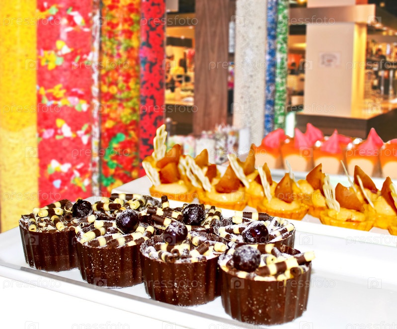Разнообразные пирожные на витрине в кафе
