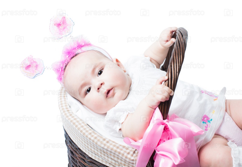 Красивый младенец в корзине на белом фоне