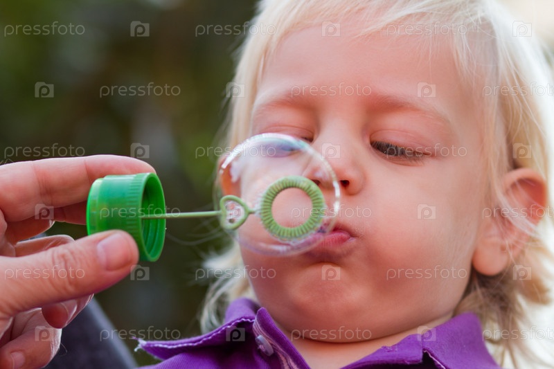 Милый белокурый мальчик дует пузыри
