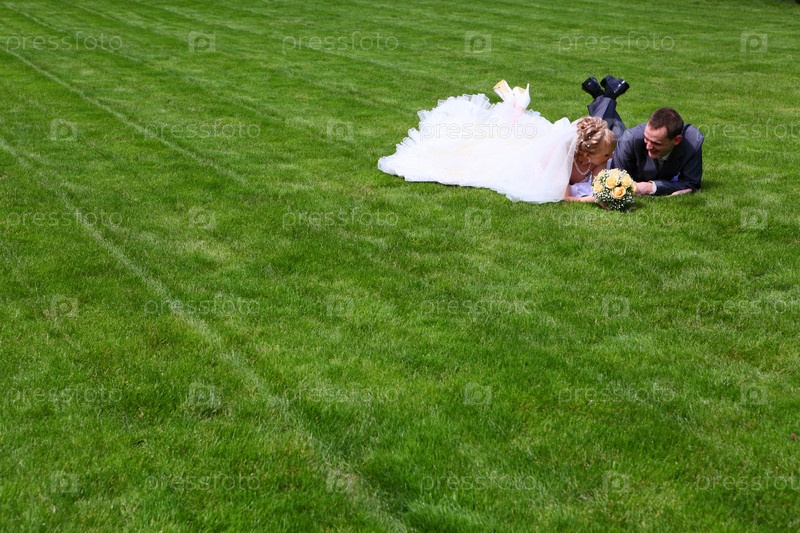 Молодожены лежат на траве