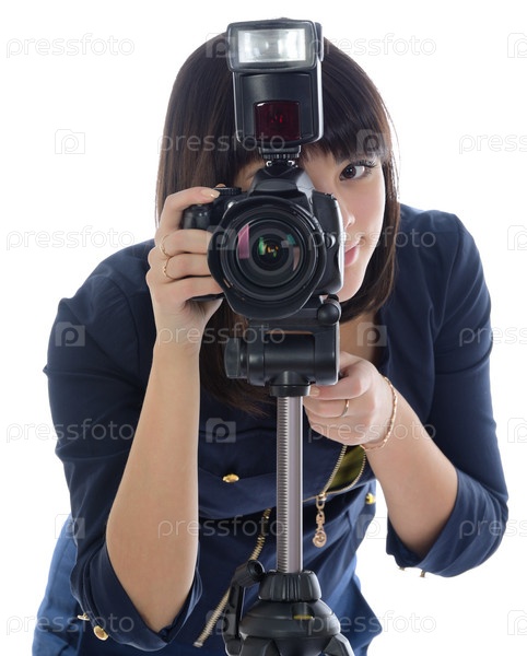 Девушка с полупрофессиональным фотоаппаратом на штативе