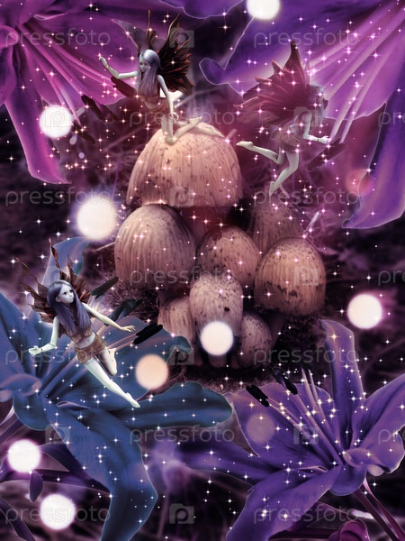 Фантастические грибы с цветами и феи