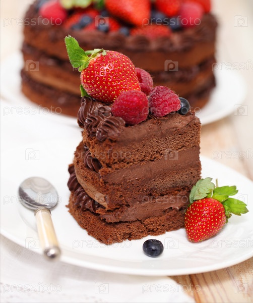 Кусок шоколадного торта с глазурью и свежими ягодами