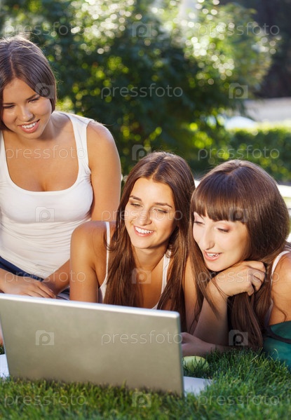Счастливые молодые студентки с ноутбуком