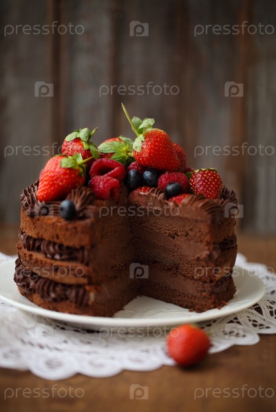 Кусок шоколадного торта с глазурью и свежими ягодами