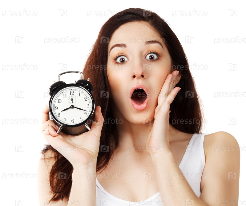 Удивленная молодая брюнетка, держащая будильник