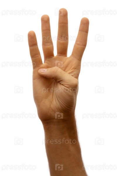 Рука человека показывает четыре пальца на белом фоне