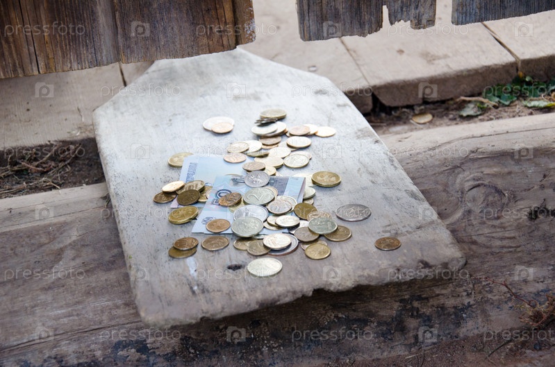 Монеты и банкноты лежат на деревянной лопате