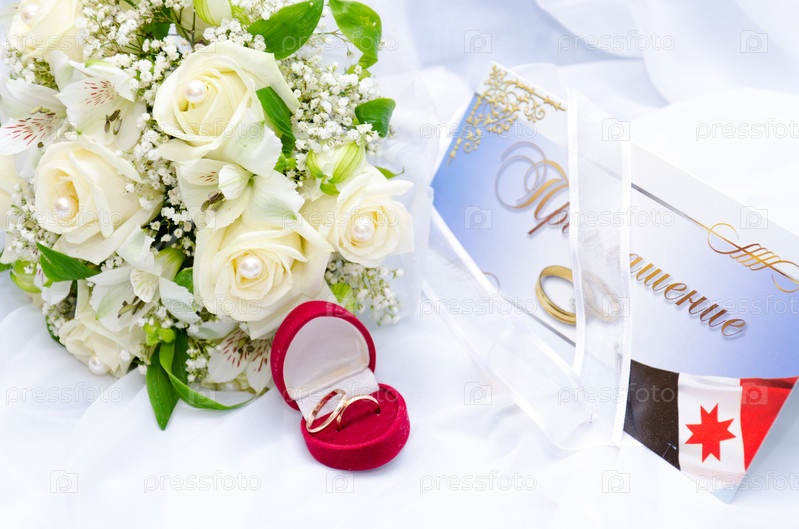 Обручальные кольца и букет роз