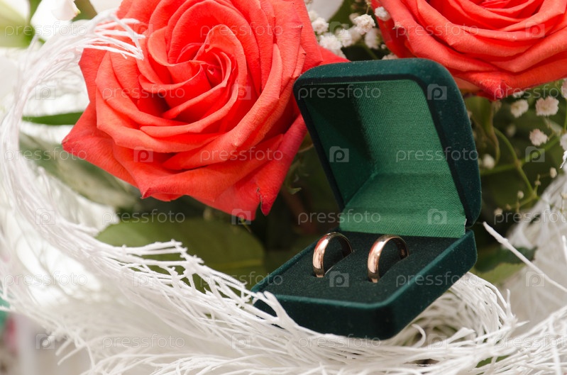 Обручальные кольца и букет роз