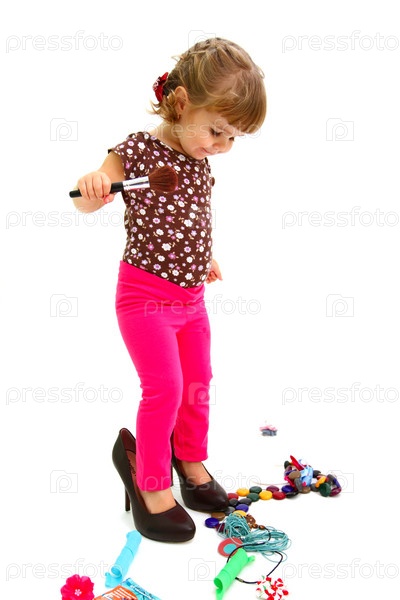 Маленькая девочка и большие туфли, изолированные на белом фоне
