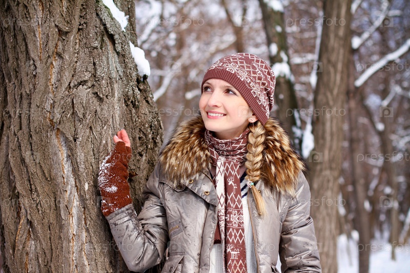 Портрет улыбающийся молодой женщины в зимнем парке на открытом воздухе