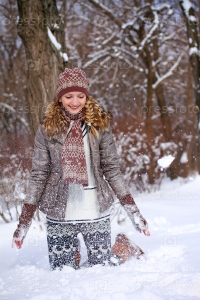Девушка играет со снегом на открытом воздухе