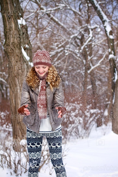 Девушка играет со снегом на открытом воздухе