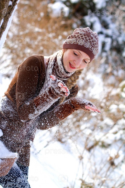 Милая девушка играет со снегом в зимнем парке на открытом воздухе