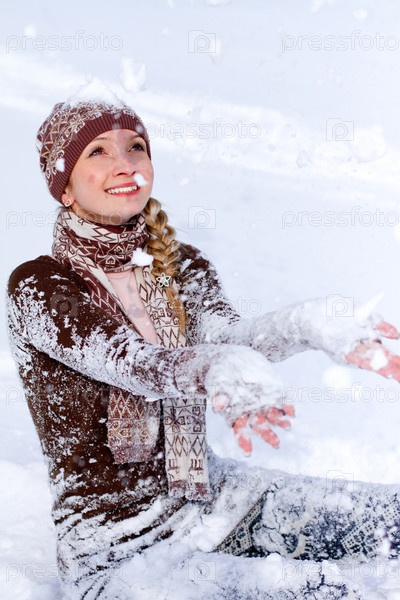 Счастливая молодая женщина играет со снегом на открытом воздухе