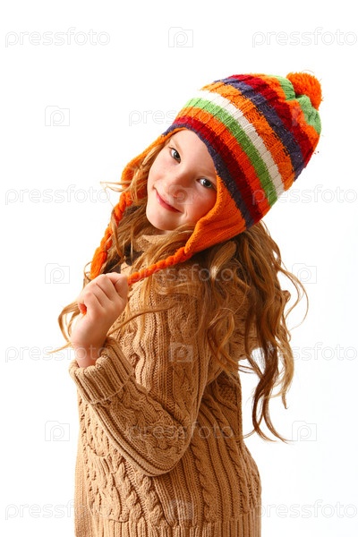 Кокетливая маленькая девочка в уютной одежде, изолированная на белом фоне