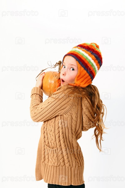 Удивленная маленькая девочка с тыквой, изолированная на белом фоне