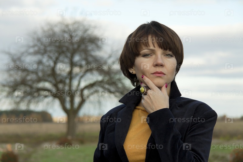 Грустная женщина с рукой на подбородке