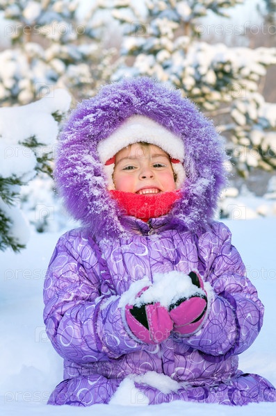 Веселая девочка играет в зимнем лесу