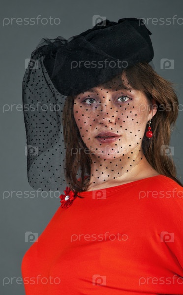 Портрет молодой девушки в черной шляпе с вуалью в красном платье