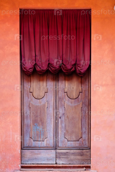 Деревянная дверь с красным занавесом