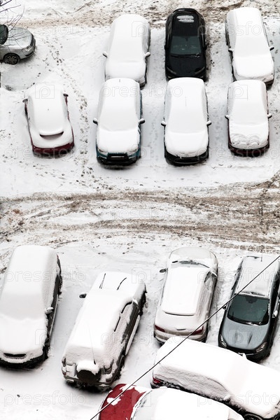 Покрытые снегом автомобили на стоянке