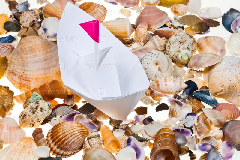 Бумажный кораблик на фоне морских раковин
