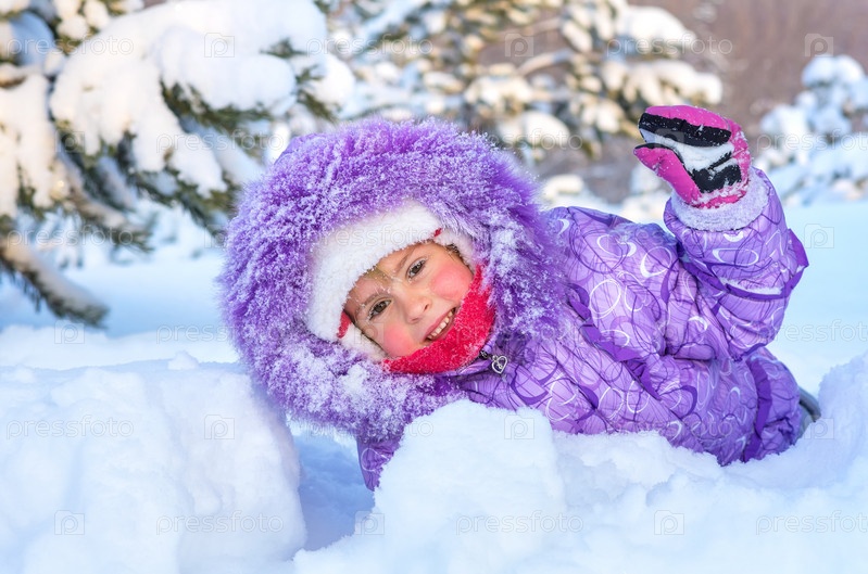 Радостная девочка играет в зимнем лесу