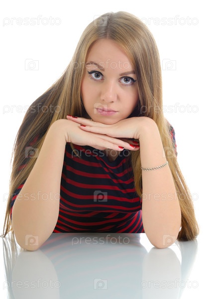 Задумчивая молодая женщина на белом фоне