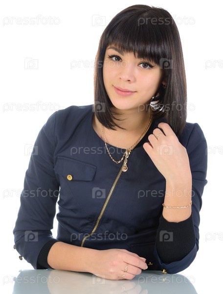 Задумчивая молодая женщина на белом фоне
