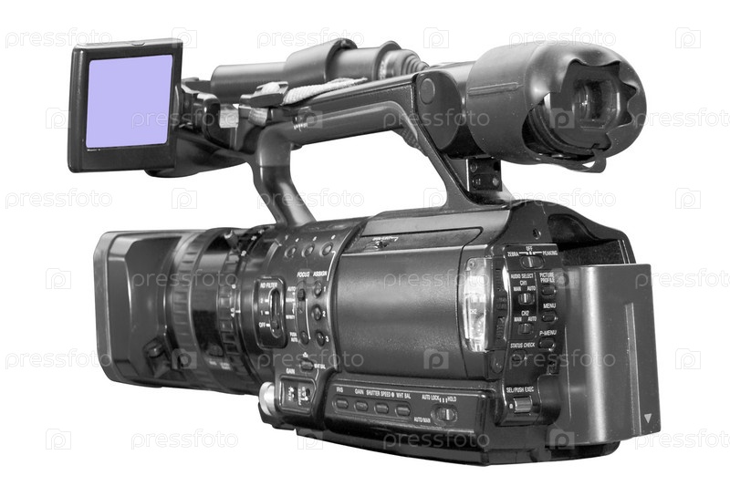 Профессиональная видеокамера на белом фоне