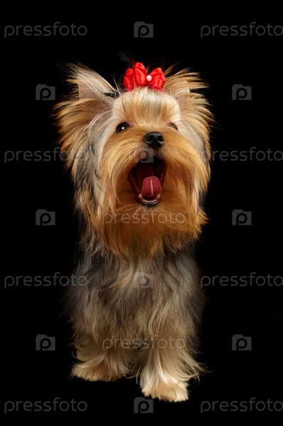 Йоркширский терьер, изолированный на черном. Зевает, как будто поет